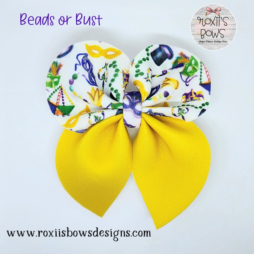 These festive bows will fill your heart full of cheer! Perfect for your little ones Mardi Party ensemble! These colorful hair accessories are Mardi Gras inspired designs. Order these bows for your little ones festive accessories!