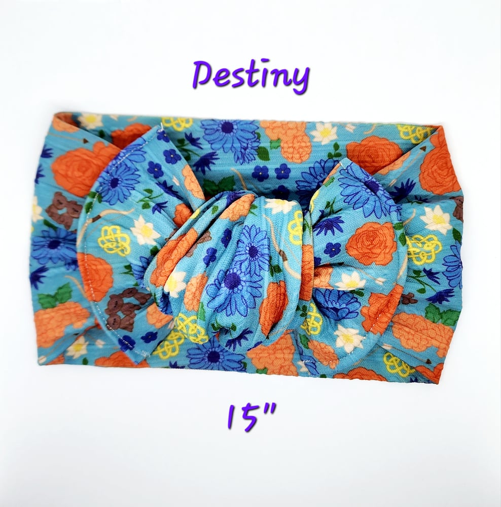 Headband is hand-tied and not glued or sewn on. Sizing is based on average head size at the given age. All items are handmade so sizing may vary slightly. Our bows and head wraps come from a smoke free, pet free home!