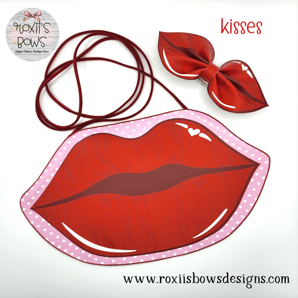 Kisses: 5"h×9"w includes a matching 4" bow attached to an alligator clip with teeth