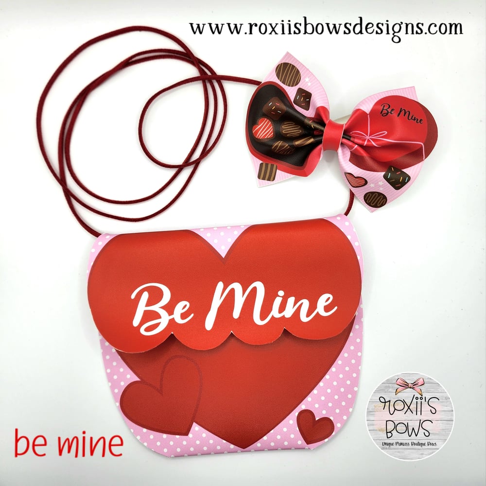 Be Mine: 5"h×6"w includes a matching 4" bow attached to an alligator clip with teeth. Purse flap is closed by velcro.
